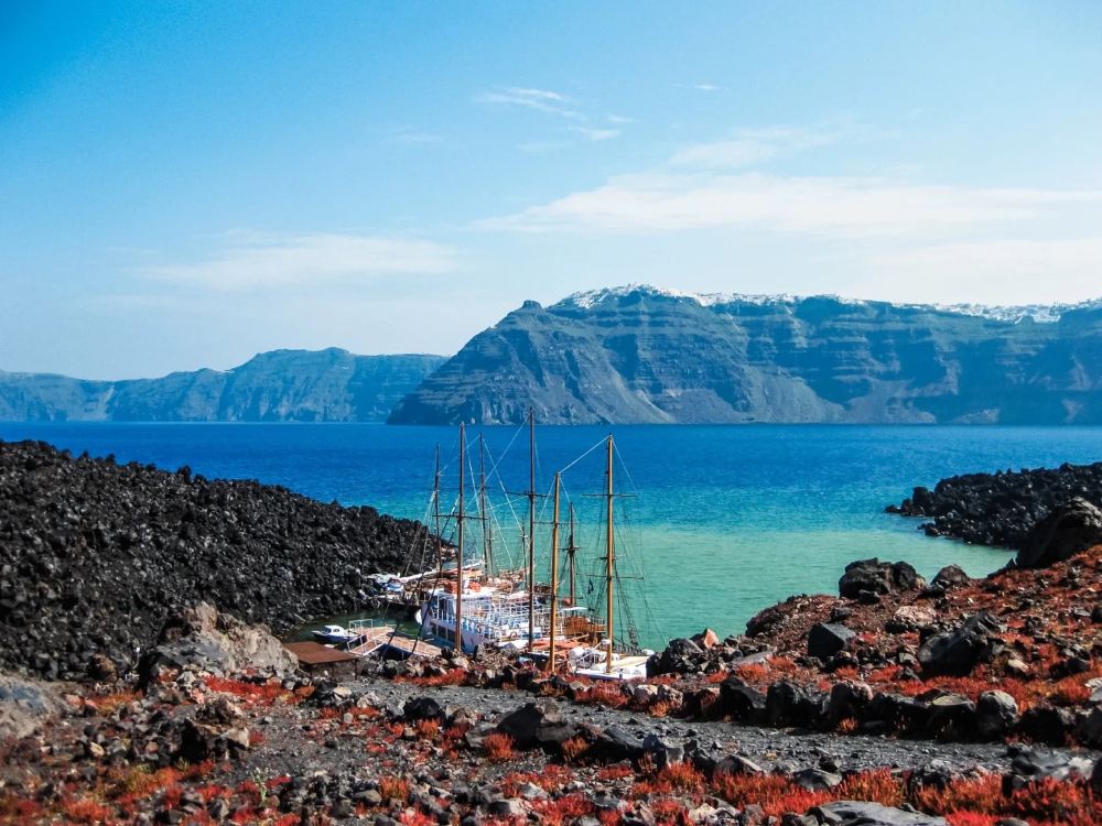 ▲ 踏上風景優美且經濟實惠的聖托里尼島著名火山之旅。從費拉港出發,享受輕鬆的10分鐘乘船之旅,前往尼亞卡美尼火山灣。花1小時15分鐘探索該地區 - 可以從下面欣賞風景,也可以沿著短路徒步到達頂部,那裡活躍的火山口釋放著煙霧和硫磺。在前往帕萊亞卡梅尼島之前,拍攝這自然奇觀的令人驚嘆的照片。在這裡,您可以沉浸在治療性溫泉和天然泥浴中,水溫保持舒緩的溫暖。在結束您難忘的冒險之前,您可以在這個獨特的熱點游泳和浸泡,周圍環繞著聖托里尼島令人驚嘆的火山景觀。非常適合快速而難忘的度假!