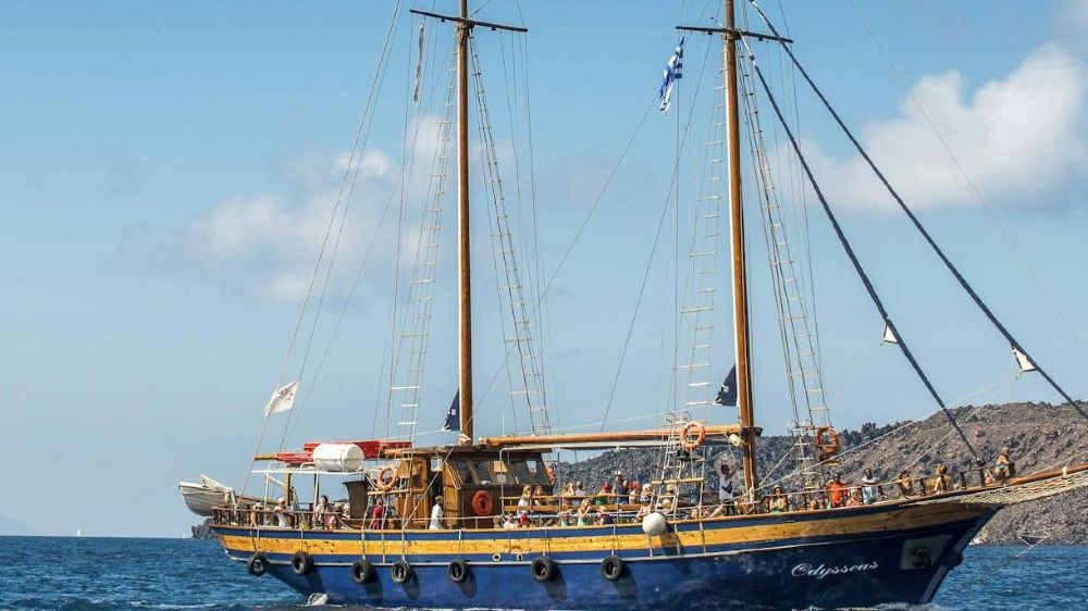 A-卡美尼火山島拼船遊 | 英文 | 於集合地點集合 | 拼團 | 40位旅客 | 普通導遊 | 回程於指定地點解散