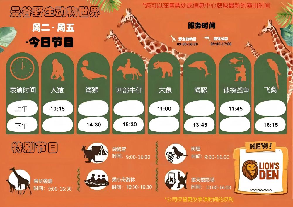 【 週二至週五表演時間表 】僅供參考,具體時間以動物園當日公佈為準