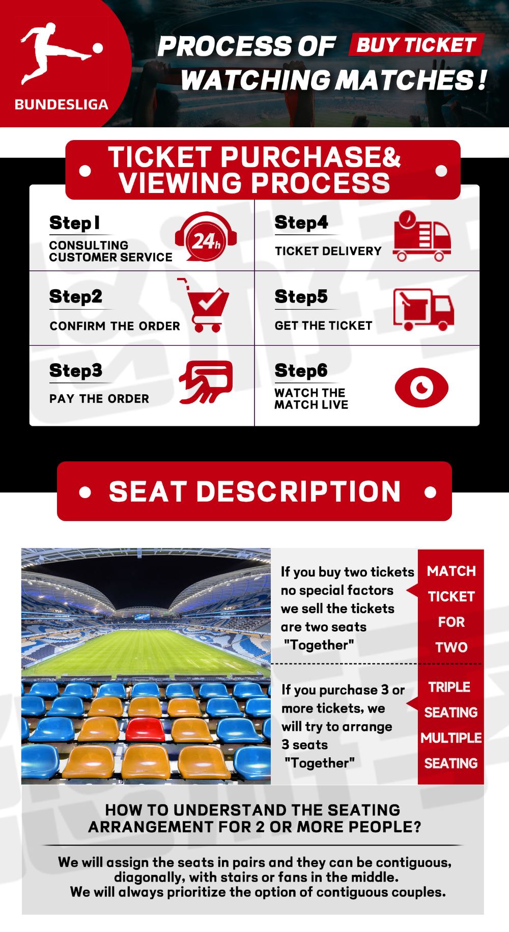 4、本場賽事價格為兩連座的單張票價,只能保證座位兩兩相連,如多人購票需連座,請務必購票前聯繫客戶服務支援,我們須重新報價,並將盡力為您安排。