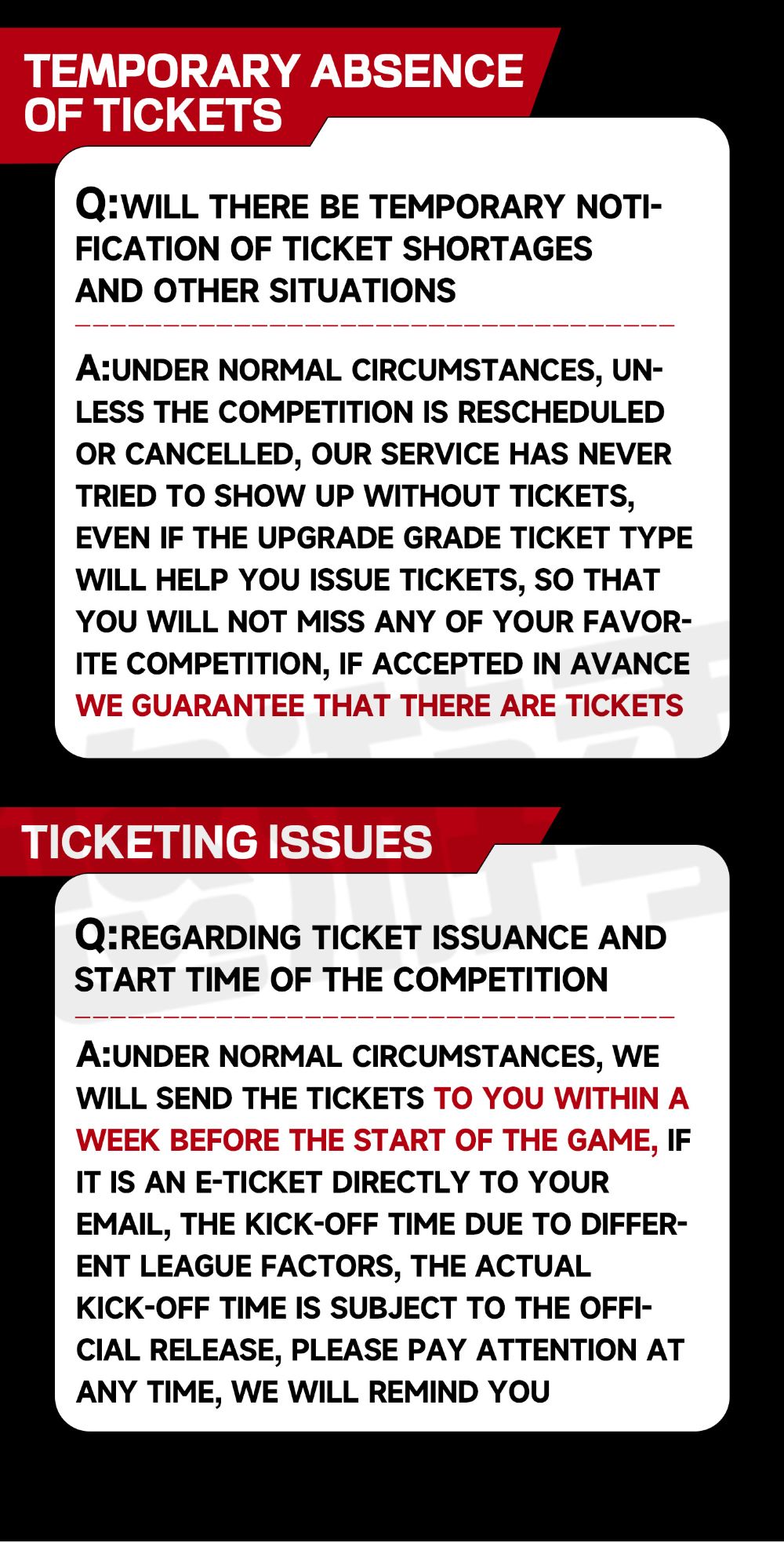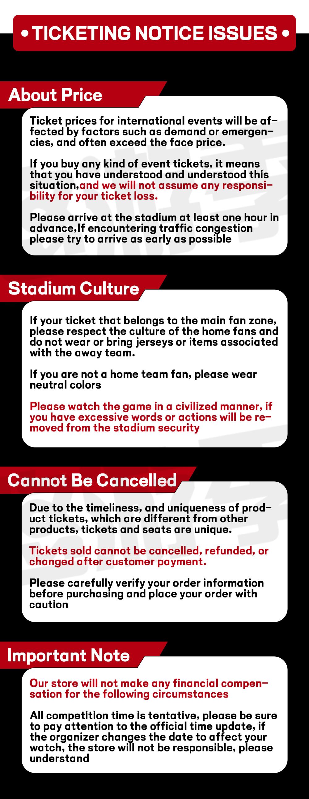 【落單前必讀!!】訂單確認後我哋將唔會發送任何入場憑證,正式門票為電子票或者實體卡,正式門票發送時間以客戶服務支援為準。因賽事主辦方變更比賽時間等原因導致原定比賽日程喺您訂單確認後產生變化或者取消,並因此影響您嘅行程,我哋將對此唔承擔責任,訂單一經確認不退不改。