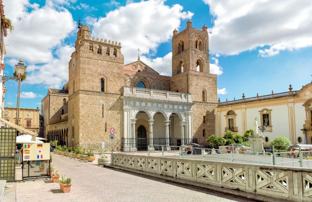 ▲ 蒙雷阿萊大教堂坐落於意大利西西里島巴勒莫附近的蒙雷阿萊小鎮,是世界文化遺產,也是中世紀建築藝術的傑出代表。其建築風格融合了拜占庭、阿拉伯和諾曼元素,外觀呈現出拜占庭式的十字形佈局,外牆以淡黃色石灰岩砌成,莊重古樸;四個巨大的塔樓矗立在教堂四角,盡顯威嚴氣勢。 走進教堂內部,令人震撼的是覆蓋了整個穹頂與牆壁的金色馬賽克鑲嵌畫,總面積達6300平方米。這些畫作以《聖經》故事為主題,描繪了從創世紀到末日審判的場景,人物栩栩如生,金色背景在光線照耀下熠熠生輝,營造出神聖莊嚴的氛圍。