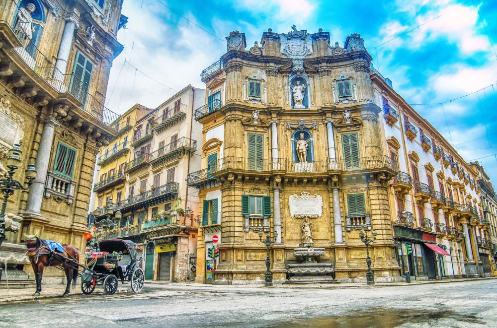 ▲ 四角場是巴勒莫老城的中心,位於Emanuele大街和Maqueda大街的交叉口,將老城的名勝古蹟分割成了四個區域。 交叉口的四角分別是半弧形的巴洛克建築立面,每座建築都有三層,從下至上分別是代表四季的噴泉雕塑、西西里的四位西班牙國王以及巴勒莫的四位守護者。
