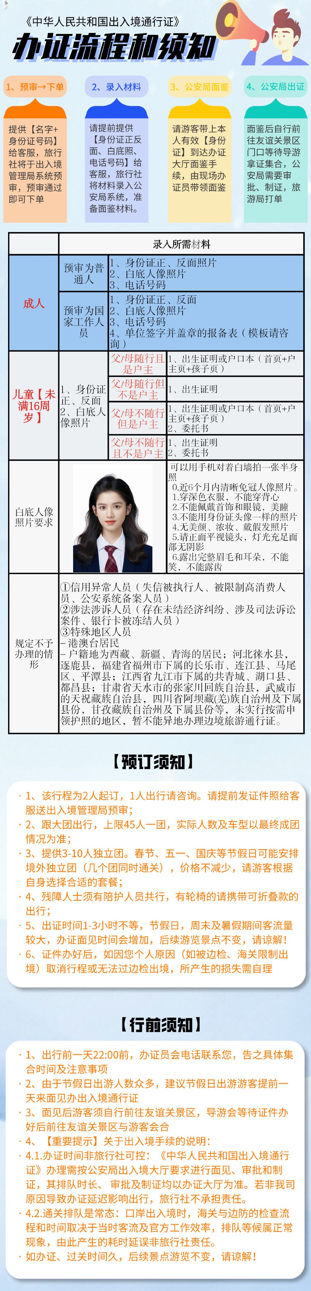 【憑祥市辦證大廳離友誼關18公里】 1、請提前將材料照片發給客戶服務支援: (1)中國內地身份證正反面 (2)電話號碼 (3)白底照片 (4)未滿16週歲兒童需監護人隨行,還需提供戶口本/出生證明照片或掃描件 2、排隊面見、出證時間1-3小時不等,節假日期間客流量大可能遇到網絡不穩定等不可控因素,導致排隊辦證時間增加,後續行程景點不變,請諒解! 3、辦證員會提前一天22點前電話聯繫,請注意接聽!如未收到請聯繫客戶服務支援在集合地點集合