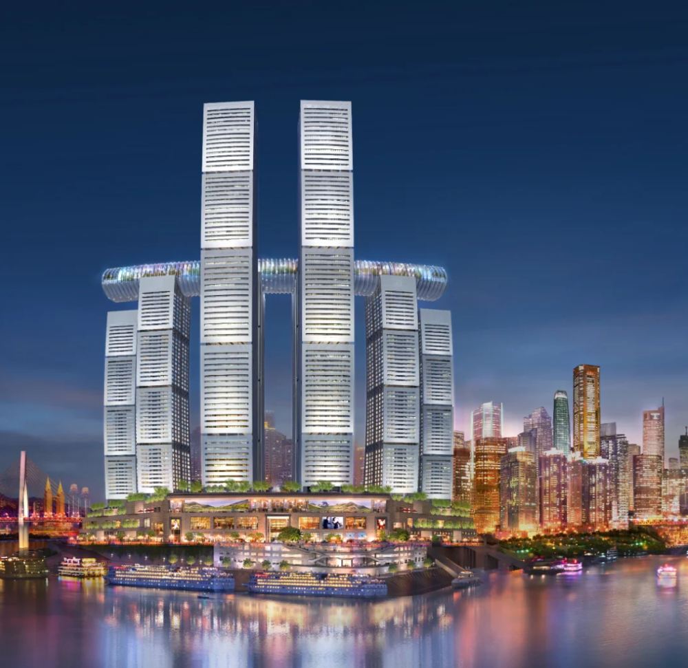 ▲ 當摩登高樓邂逅山城韻味,你一定會想到的就是來福士了,現代摩登的高樓大廈與充滿韻味的建築相互交織,碰撞出獨屬於重慶的視覺盛宴。 來福士廣場標誌性的空中連廊,彷彿一條巨龍橫跨在高樓之間,成為重慶天際線中亮眼的存在。