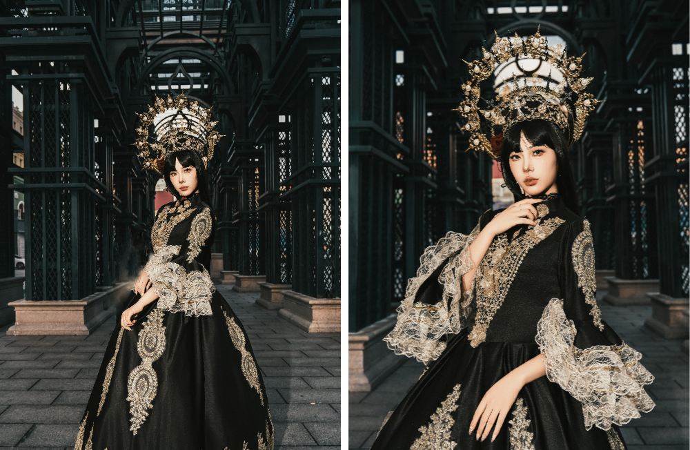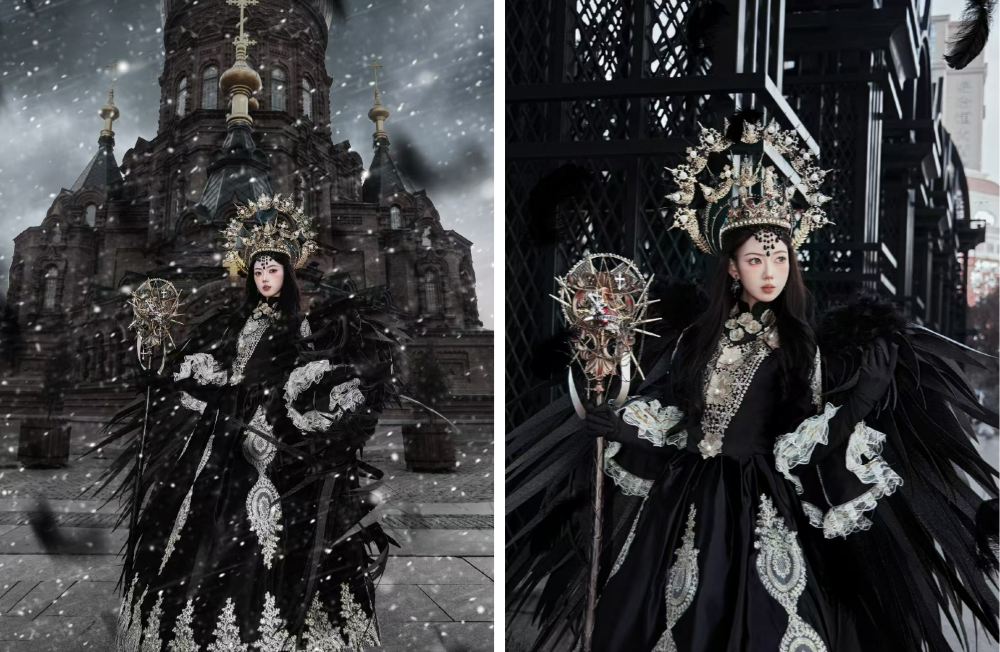 - 黑紗配銀紋服裝,手持華麗權杖、披著黑色羽毛,教堂雪景作為背景,營造出神秘暗黑女王氣場