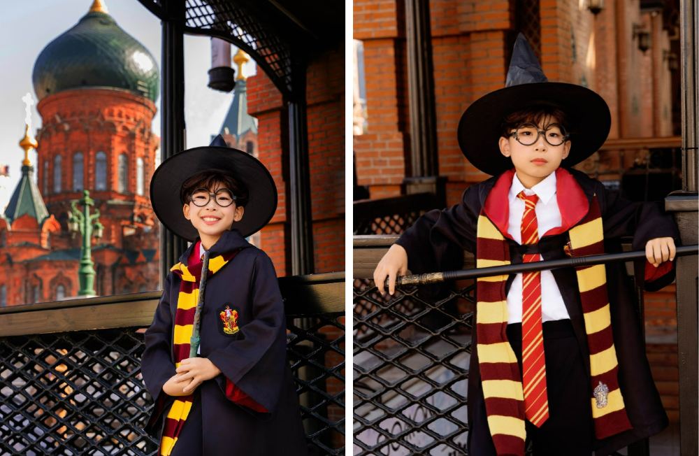 - 陽光灑落,小男孩戴著巫師帽、圍著條紋圍巾,手持魔杖,完美還原魔法世界的經典形象。建築的異國風情與魔法服飾巧妙融合,童趣之中盡顯奇幻魅力