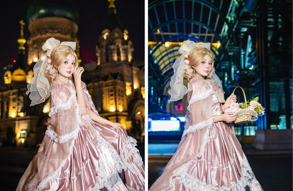 - 服飾上的蕾絲、緞帶隨光影流轉,輕鬆拍出兼具建築美學與古典優雅的大片