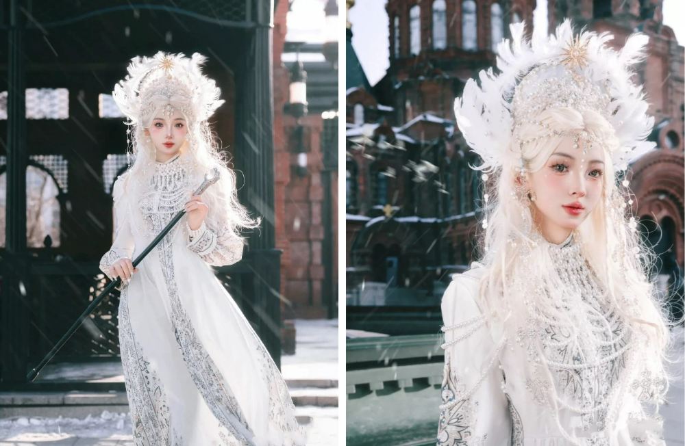 - 人物身著華麗服飾,飄雪場景更添童話般的浪漫夢幻氛圍,融合中西的獨特魅力與冬日的唯美意境