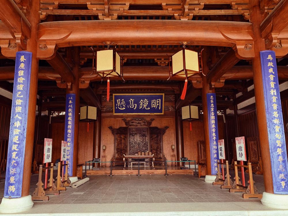 ▲ 【徽州府衙】在徽州府衙中,「明鏡高懸」匾額懸掛在大堂正中上方。大堂是知府開讀詔旨、發布政令、公開審理案件的地方。「明鏡高懸」比喻官員判案公正廉明,執法嚴格,能洞察一切。它與大堂內的楹聯、公案、儀仗等一起,營造出莊重威嚴的氛圍,彰顯了古代為官公正、清廉的理念,時刻提醒著官員要秉公執法,為民作主。
