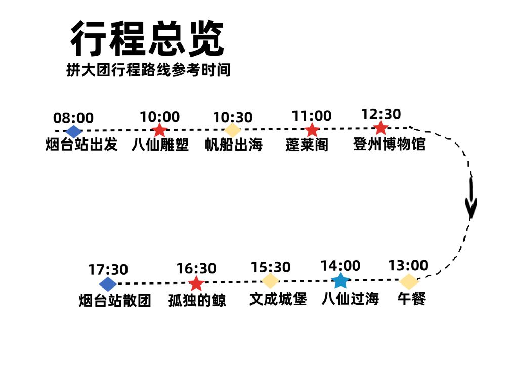17:30 煙台 煙台站-南廣場 解散 煙台市芝罘區北馬路煙台站(南廣場)對面巴士站點散團。住在煙台站附近3公里範圍內的賓館酒店可送回。行程時間作為參考,淡季和旺季會有所調整,以實際當天情況為準。