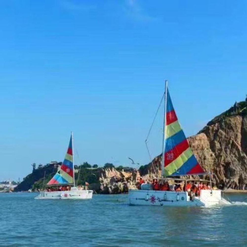 ▲ 帆船出海:雙體帆船,海上遊,餵海鷗,觀看黃海和渤海,一腳踏兩海,兩耳聽雙濤,體會漂洋過海的感覺