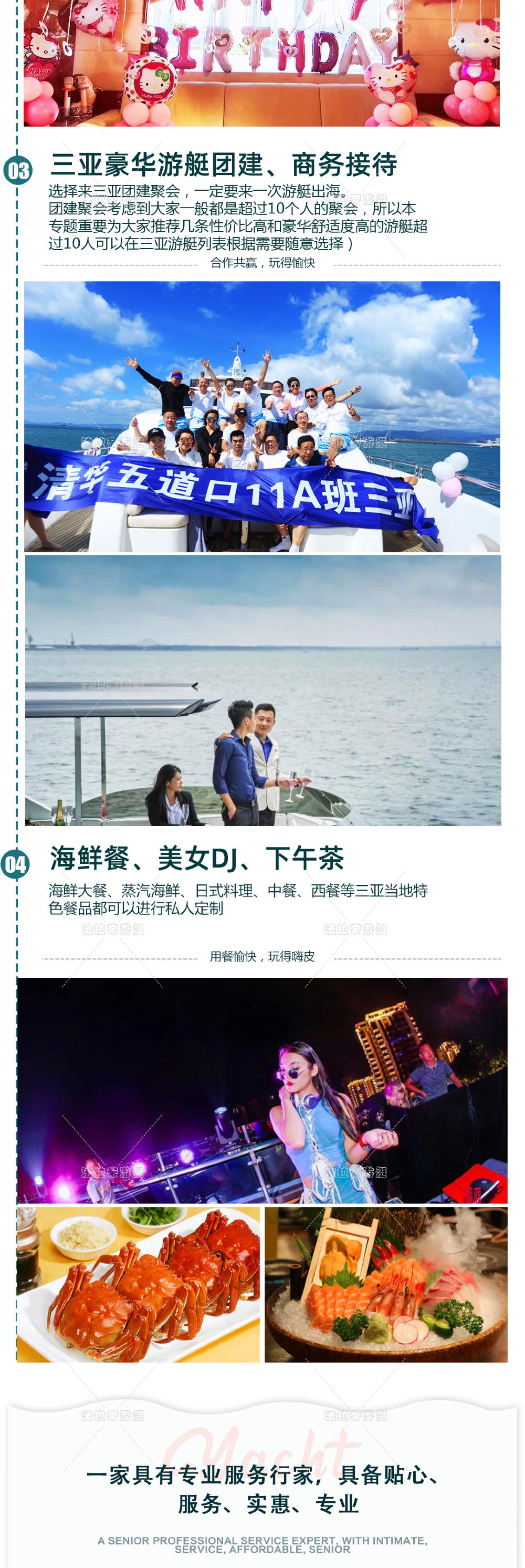 - 五星級專業團隊24小時服務 可承接大型高端企業團隊建設拓展 海上婚禮 派對狂歡 DJ 家庭/商務出海 私人專屬定制