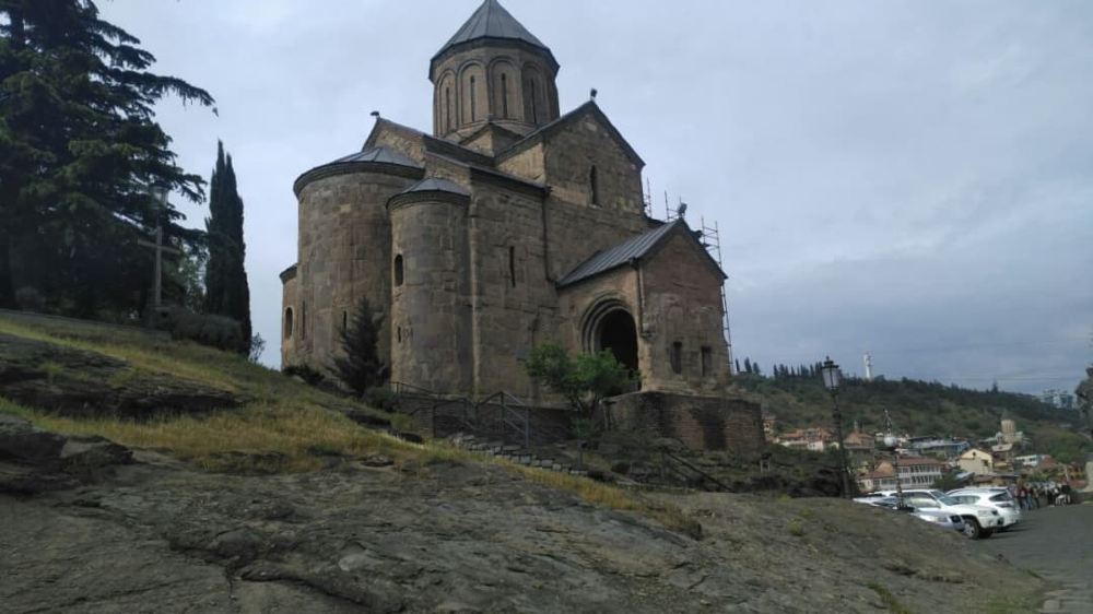 ▲ 梅特希教堂建於5世紀。它坐落喺庫拉河岩石岸上嘅山頂,可以俯瞰全城。歷史上曾經多次被毀又重建,19世紀仲曾經被用作監獄。教堂前矗立住「格魯吉亞之父」瓦赫坦格一世嘅雕像,係第比利斯極具歷史意義嘅地標之一。