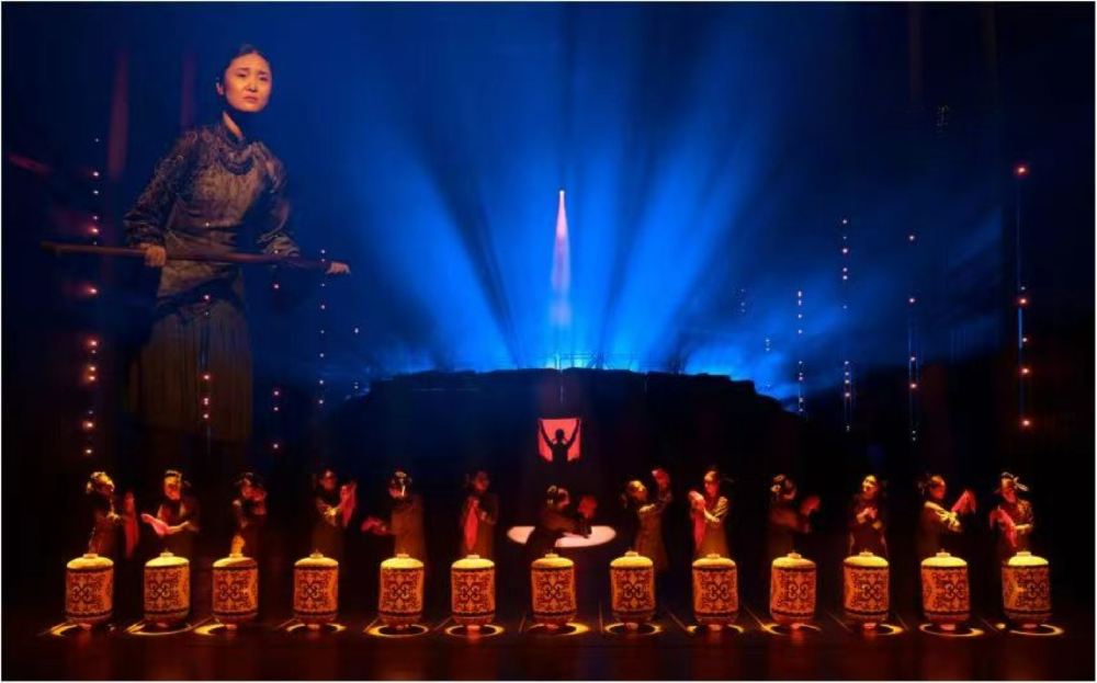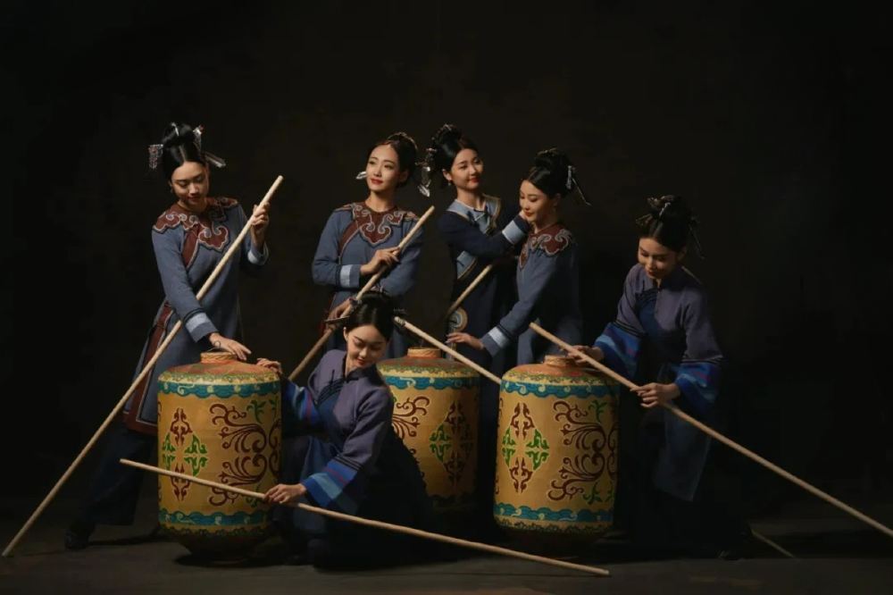 - 六位演員身著藍灰服飾,圍繞著裝飾精美、繪有傳統紋樣的鼓具,手持長桿協作表演。動作錯落間,既展現團隊配合,也將船政背景下的勞作或儀式場景具象化,凸顯歷史底蘊與藝術融合的表演風格。