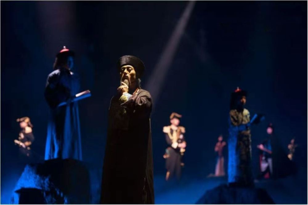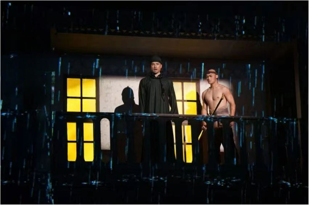 - 雨夜場景裡,兩人立於建築平台,燈光聚焦身影。營造出深沉、凝重氛圍,或許是船政歷史轉折處,先驅們面對困境、思索未來,傳遞出歷史抉擇時刻的複雜心緒