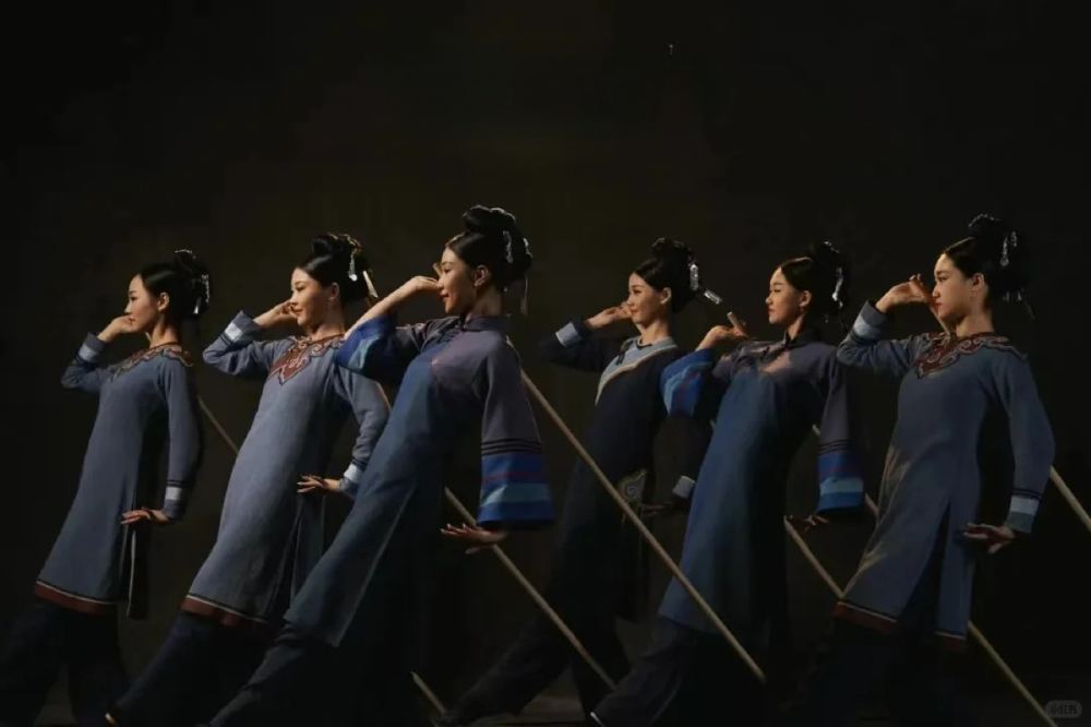 - 身著傳統服飾的舞者群像。統一的藍灰色長衫搭配精緻紋樣,髮髻規整,舞者們以整齊且富有韻律的姿態舞動