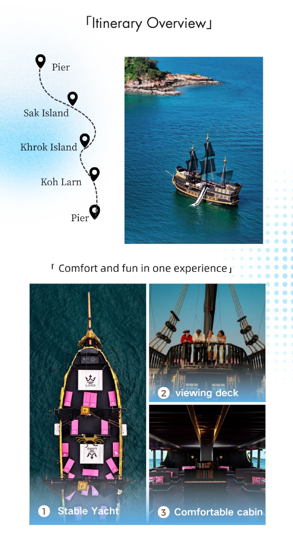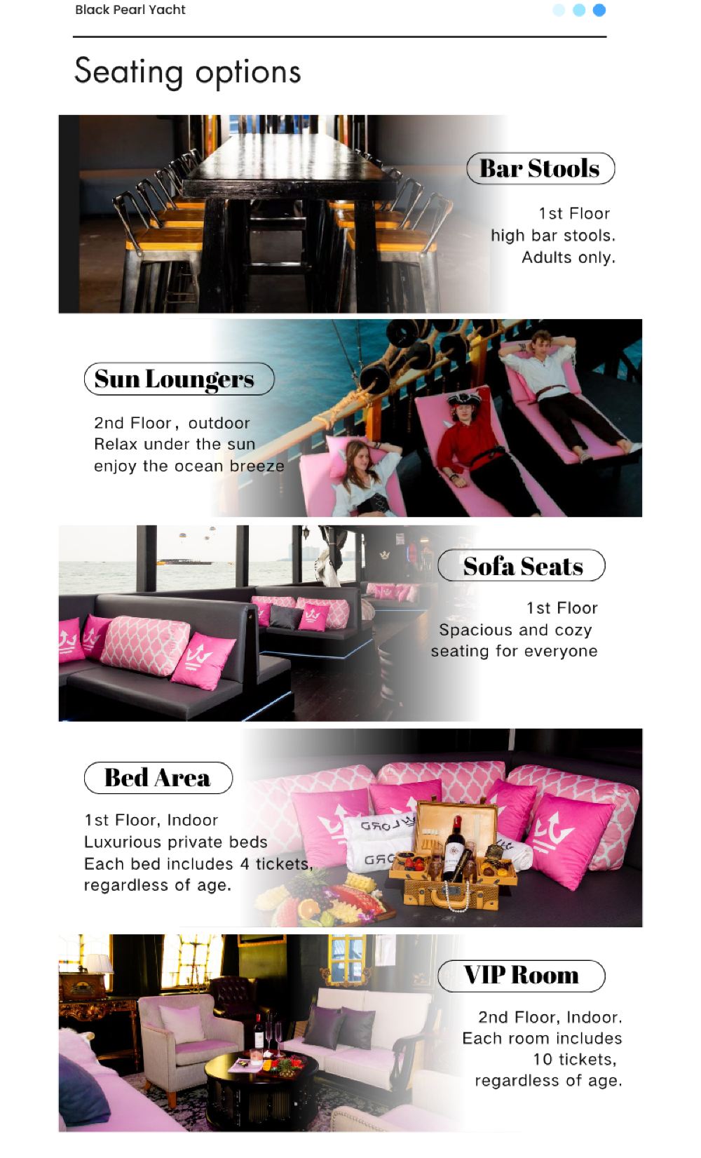 - 仿海盜船設計,VIP艙室(冷氣房、私享床)、海景梳化等多樣舒適席位