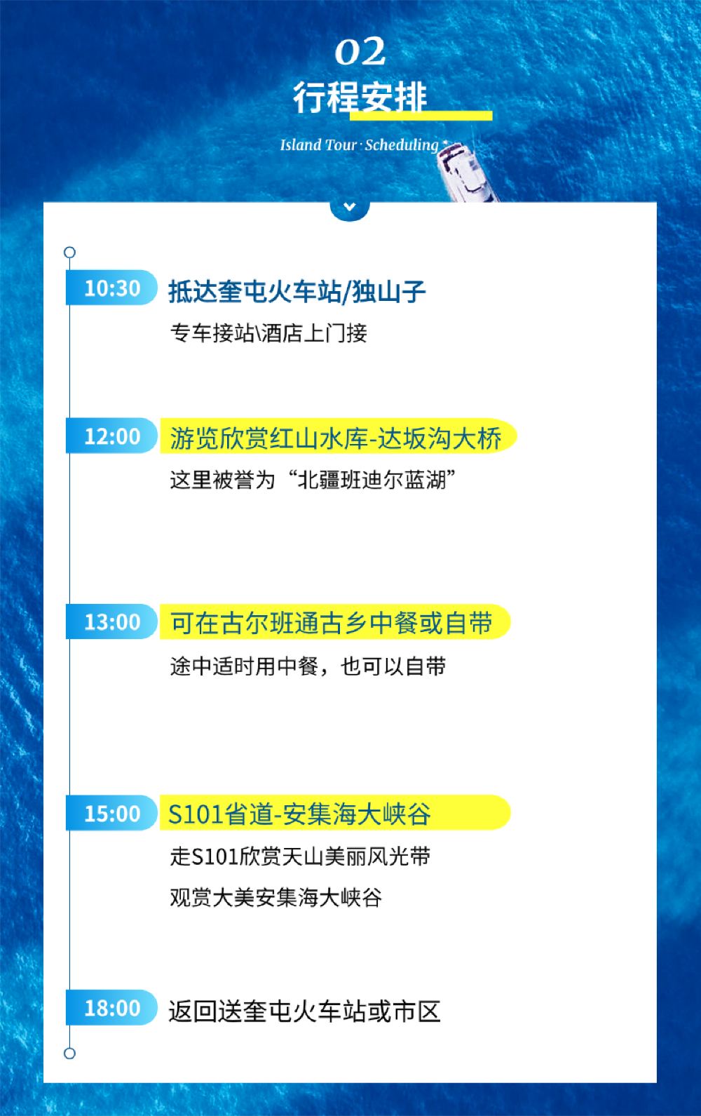 18:00 於奎屯下車 指定區域以外不提供接送服務 返回送回奎屯火車站或市區。