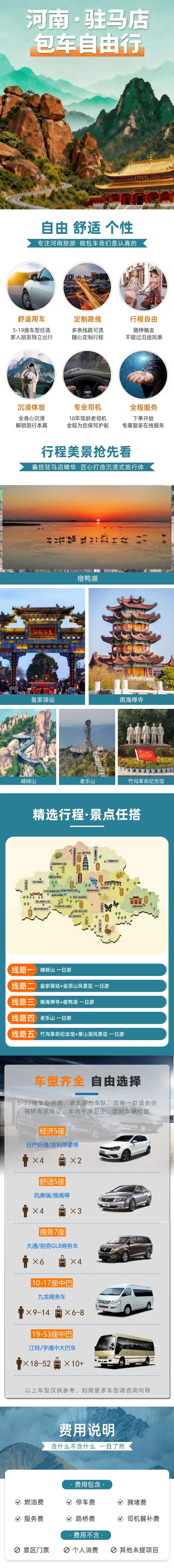 C-商務7座車包車(駐馬店來回) | 中型客貨車(7座) | 普通話 | 提供去程接送 | 獨立包團 | 6位旅客 | 只提供司機 | 不包括餐膳 | 回程接送
