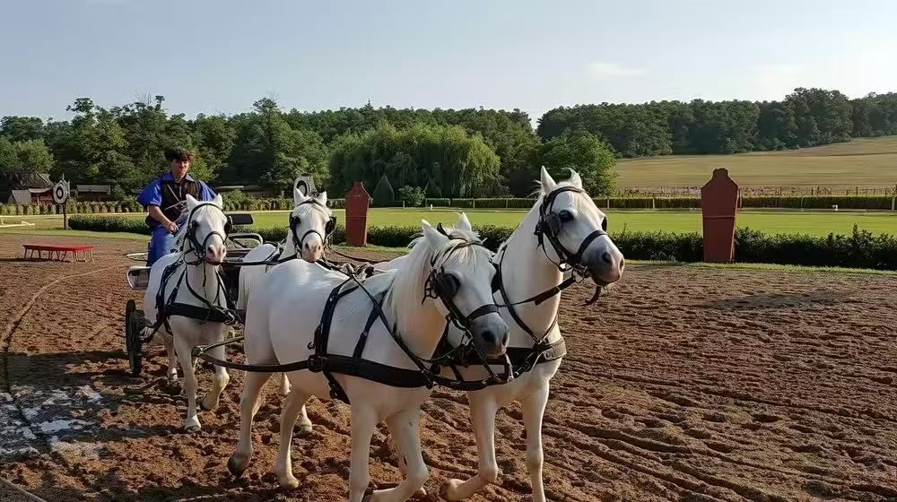 ▲ 這是公園的一大特色,遊客可以欣賞到純正的歐洲傳統馬術表演,如馬夫腳跨兩匹馬駕馭五至七匹馬入場,在沒有馬鞍奔騰的馬上表演射箭,驅使馬匹表演坐、躺、臥等高難度動作等。