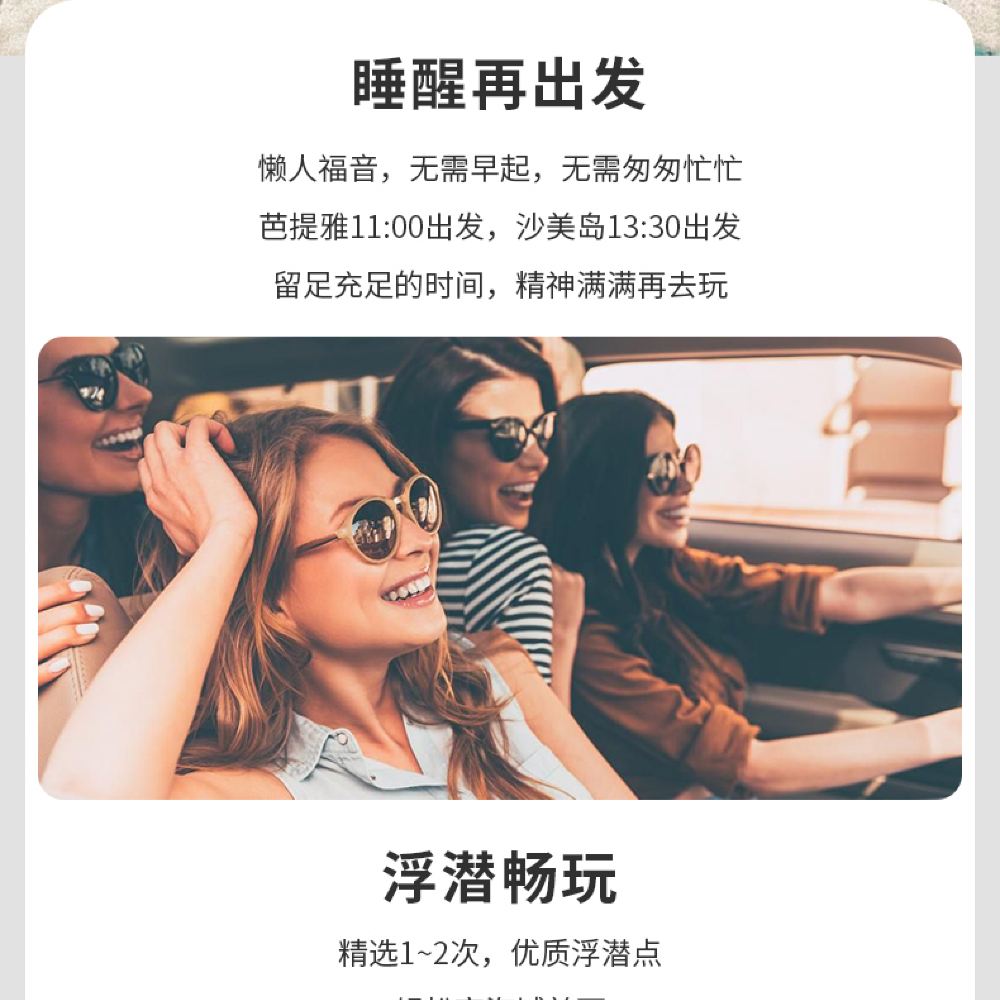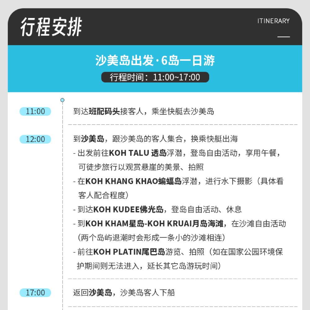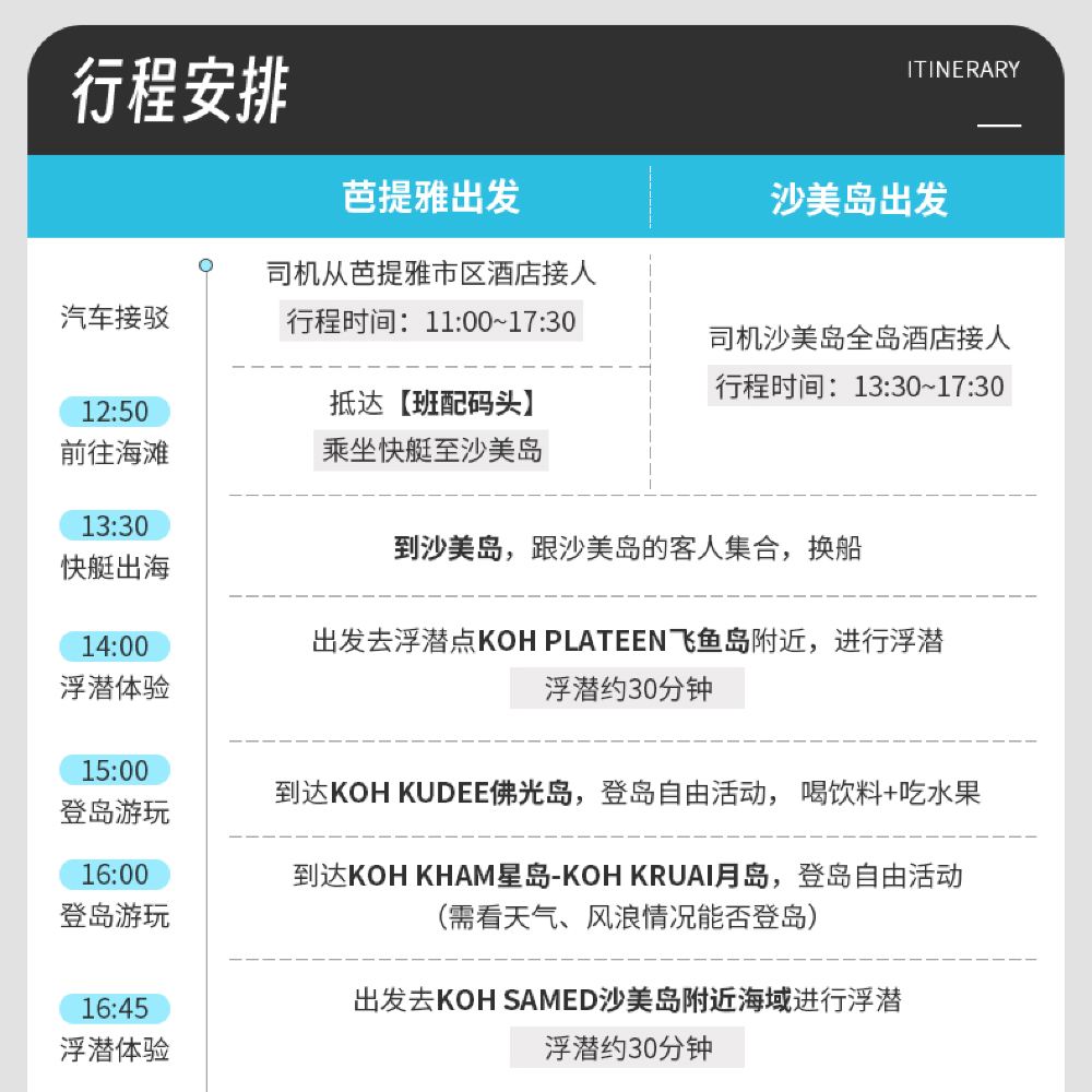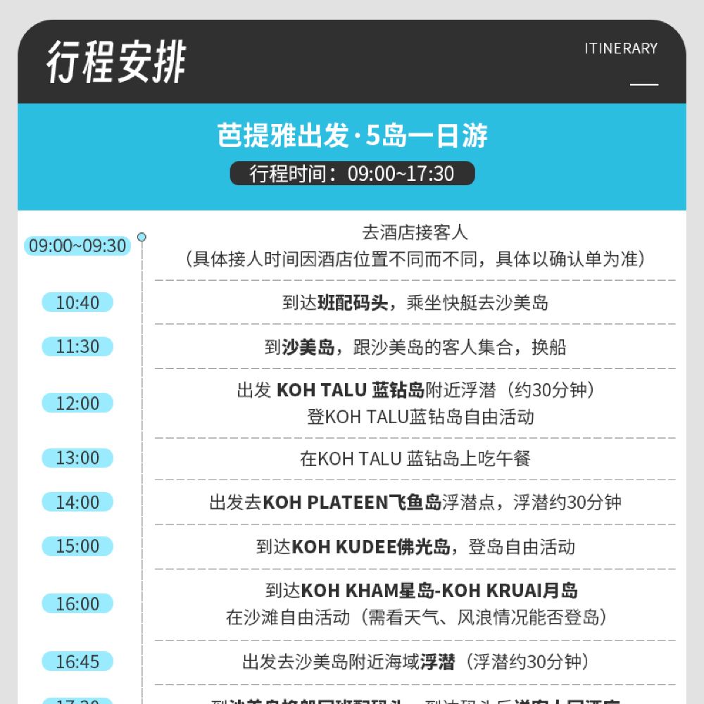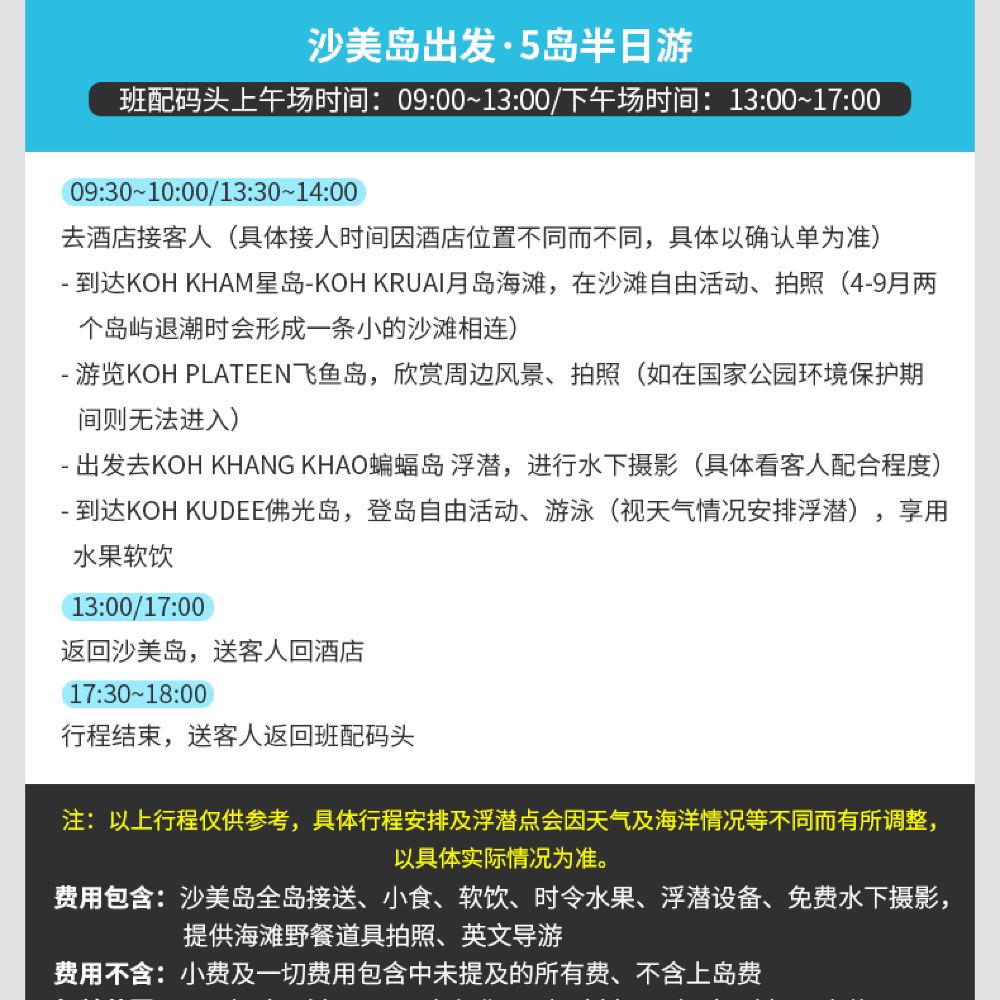 17:30 於沙美島下車 指定區域以外不提供接送服務 返回碼頭後,將開始送您回到出發酒店。由於酒店距離遠近不同,返回酒店的具體時間會略有差異,且泰國交通容易擁堵,請勿安排緊急行程~