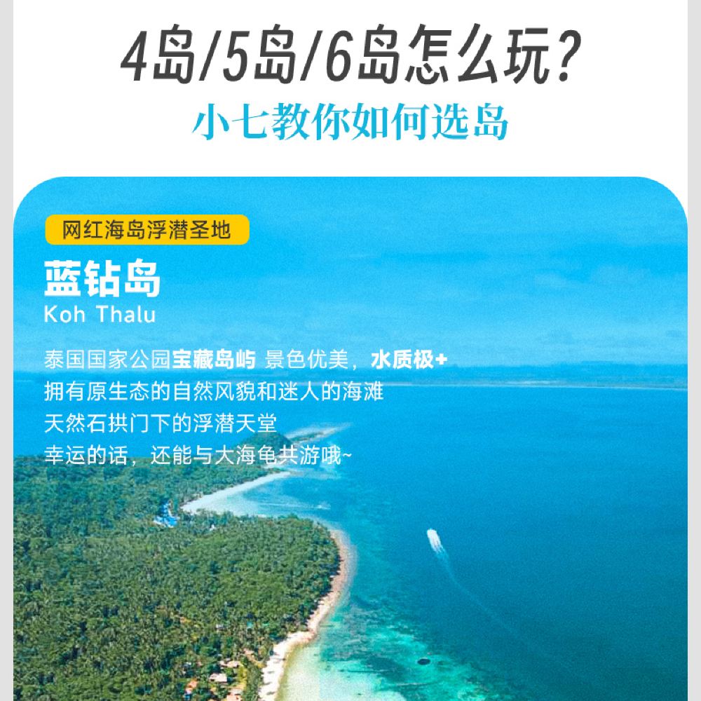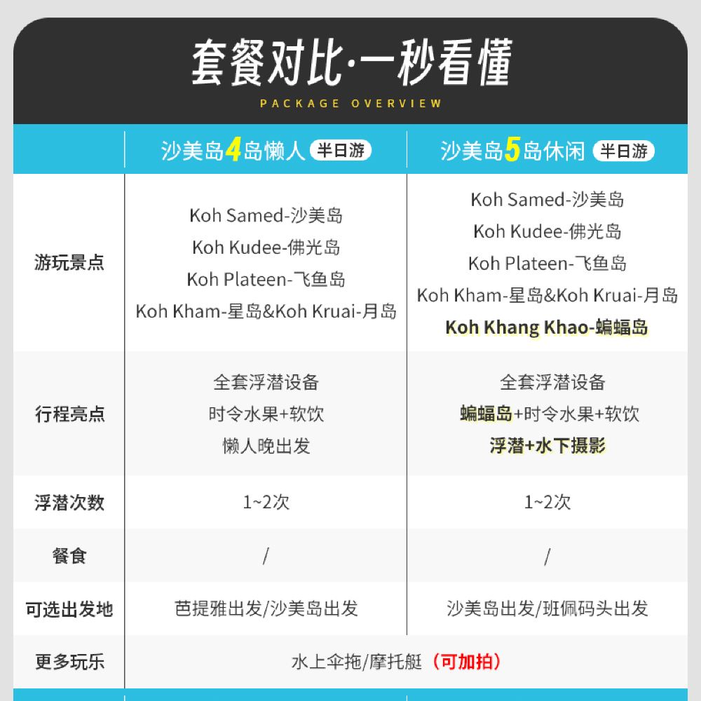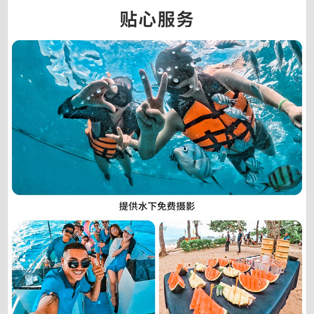 購買不同套餐,參觀不同小島 4島:飛魚-佛光島-星島-月島 5島:藍鑽/蝙蝠島-飛魚-佛光-星島-月島午餐