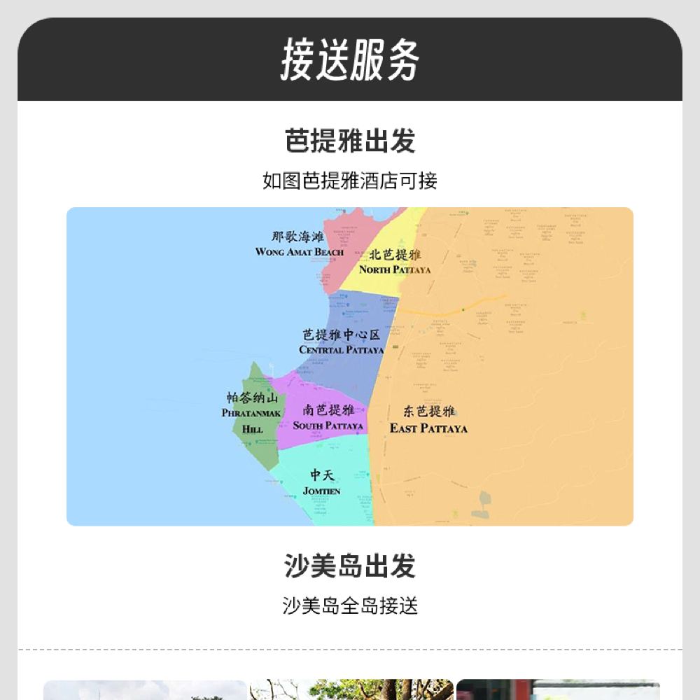 於指定地點接載09:00 芭堤雅 於指定地點接載 1. 芭堤雅市區酒店接送,請先和線上客戶服務支援確認您的酒店是否超區; 2. 拼車接送,酒店遠近不同接人時間不同,具體接人時間請參考您的確認單; 3. 泰國交通易擁堵,請您在酒店大堂耐心等待,如果超過等候時間10分鐘,請您及時聯繫線上客戶服務支援,工作人員將盡快為您協調,請見諒!