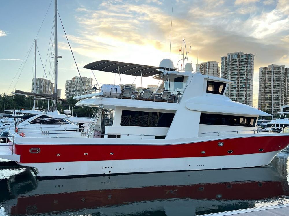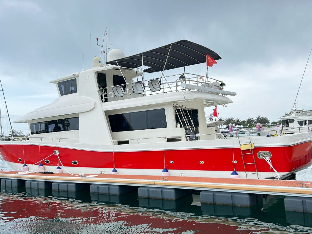 陵水清水灣億寧07 70尺專業遊釣艇,適合近海垂釣,配備專業探魚設備與寬敞釣台,穩定性佳。內飾舒適、載荷充足,伴你在澄澈海域暢享漁獲樂趣。