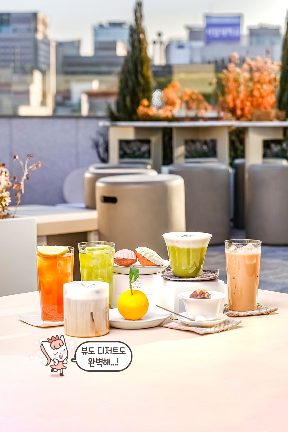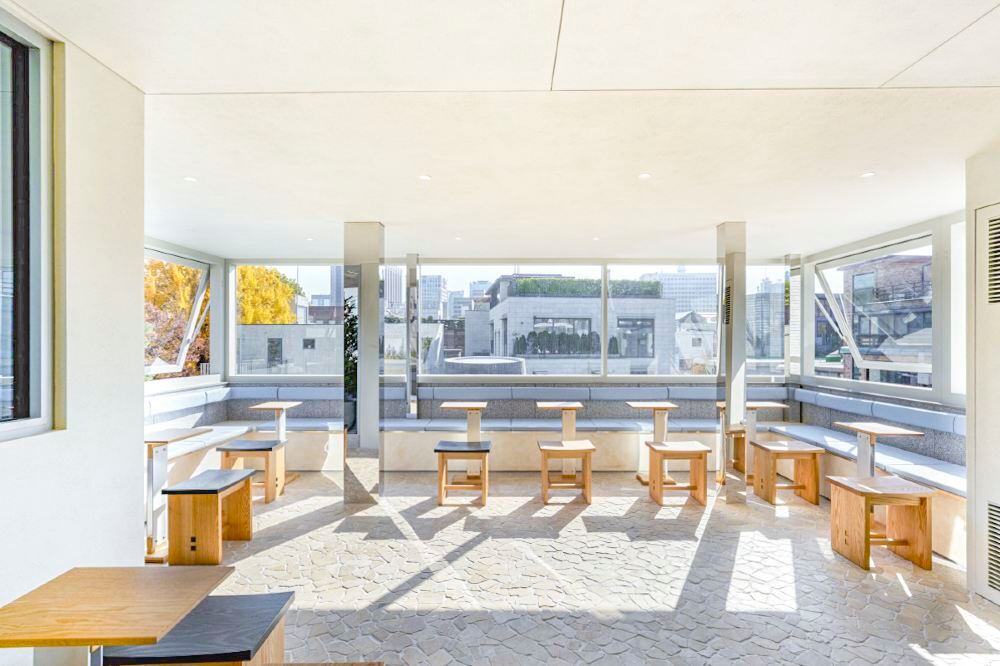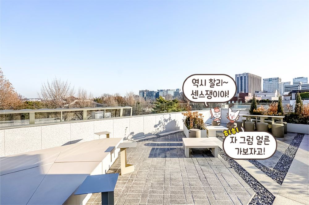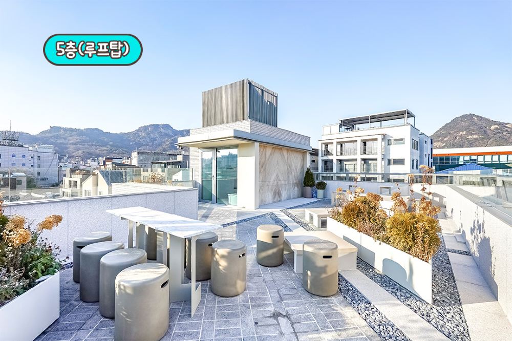 五樓設有一個天台空間,可以飽覽瑞草區的全景。從高處俯瞰,傳統韓屋屋頂的景色美不勝收,在市中心能體驗到這種風景,感覺格外特別。