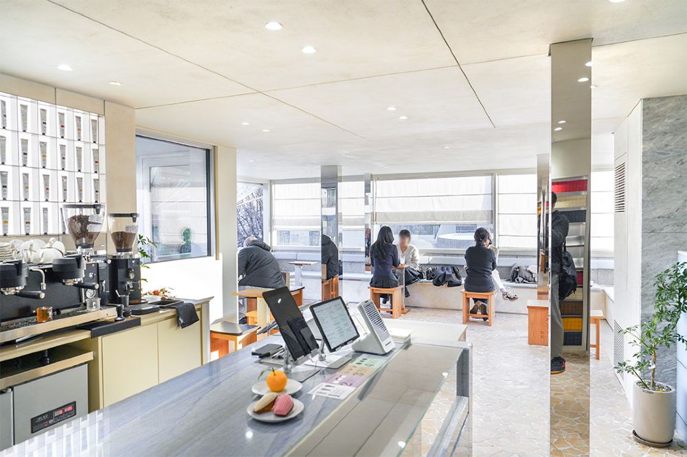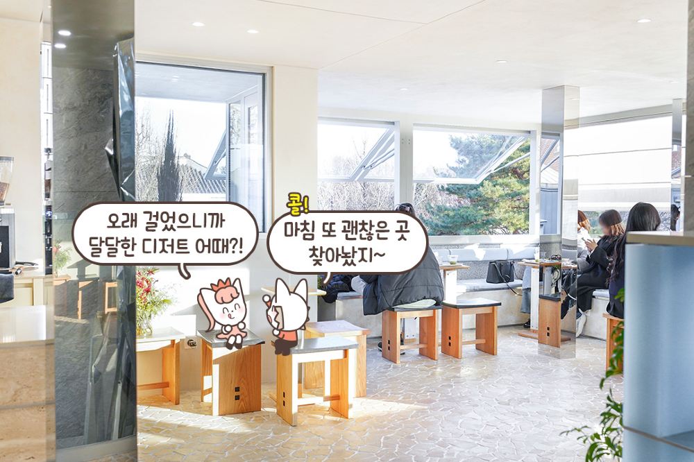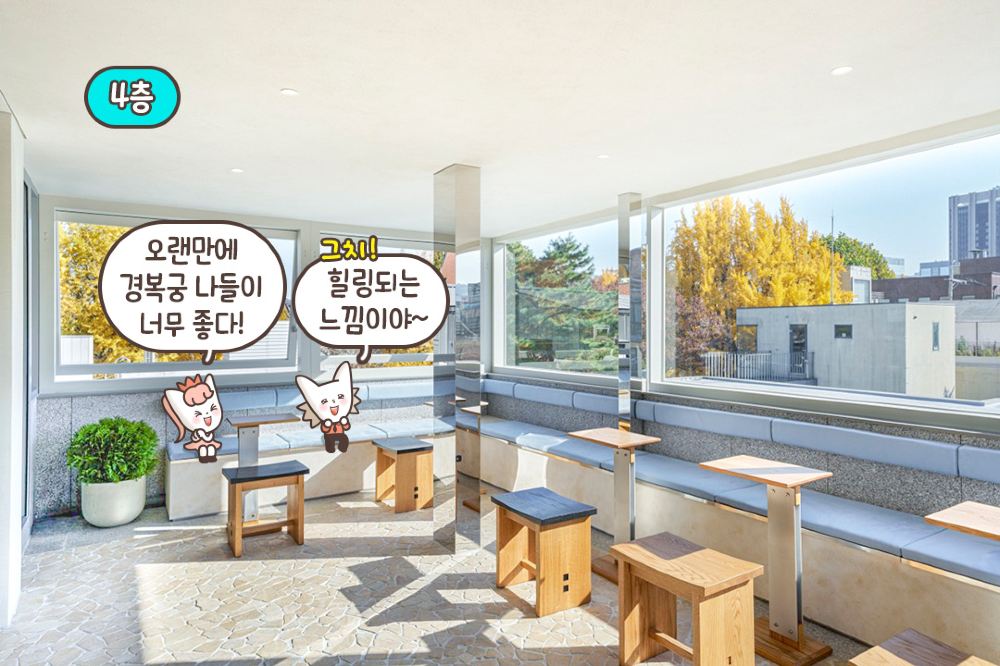 陽光透過寬敞的窗戶灑入,為空間注入溫暖,同時突顯窗外優美的景色。特別吸引我目光的是那些設計成屋頂形狀的座位,與西村(Seochon)周邊環境完美融合。整體氛圍寧靜舒適,是放慢腳步、放鬆身心的理想場所。
