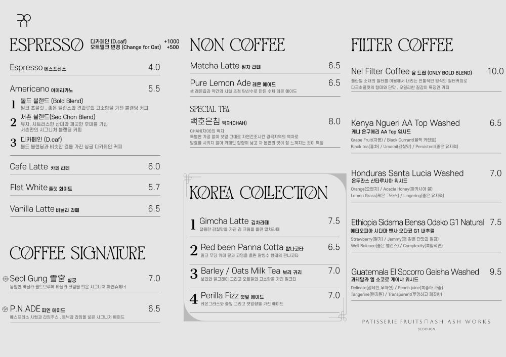 PNA SEOCHON 是由法國甜品品牌 Patisserie Fruits 與特色咖啡品牌 ASH ASH WORKS 攜手合作打造,Patisserie Fruits 由《廚藝大戰2》的主廚林河善領軍。匯聚各領域專家的這間咖啡廳,其高水準的品質在每個細節中都顯而易見。