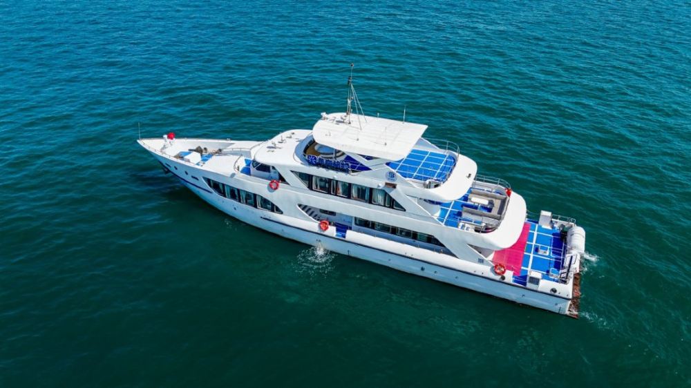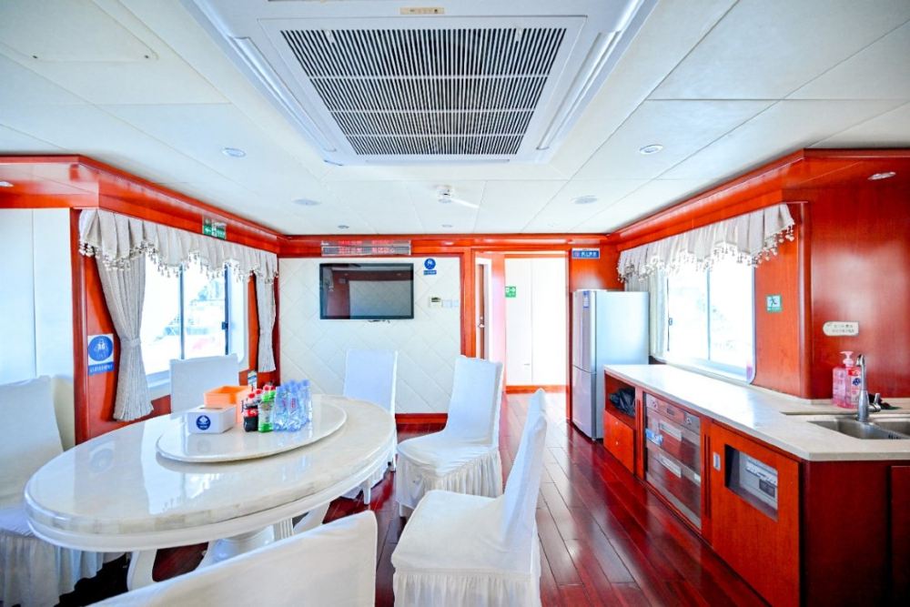 三層空間立體拓展,上層可飽覽壯闊海景,中層隱藏歡唱KTV,讓歌聲隨浪起伏;自帶滑梯從船身延伸入海,縱身一躍便是浪花裡的狂歡。