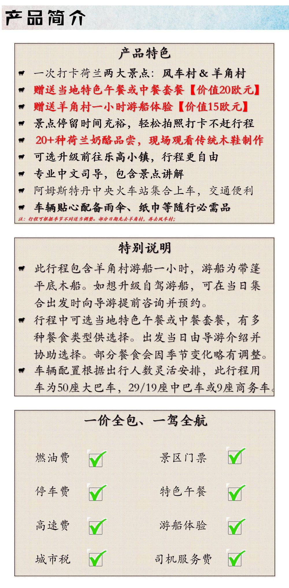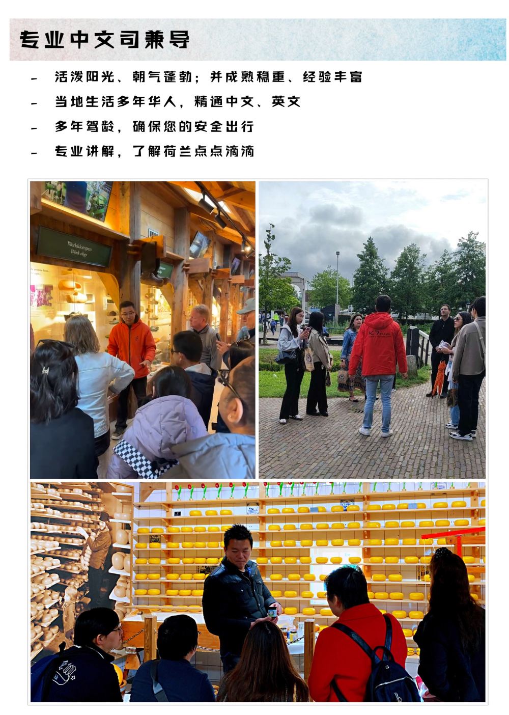 - 專業中文導遊,包含景點講解、芝士加工廠體驗、木鞋加工廠參觀