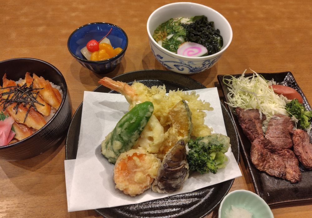▲ (可選)豪華天婦羅定食——千姫御膳 套餐內含穴子丼、烏冬麵、牛排、天婦羅及餐後水果。