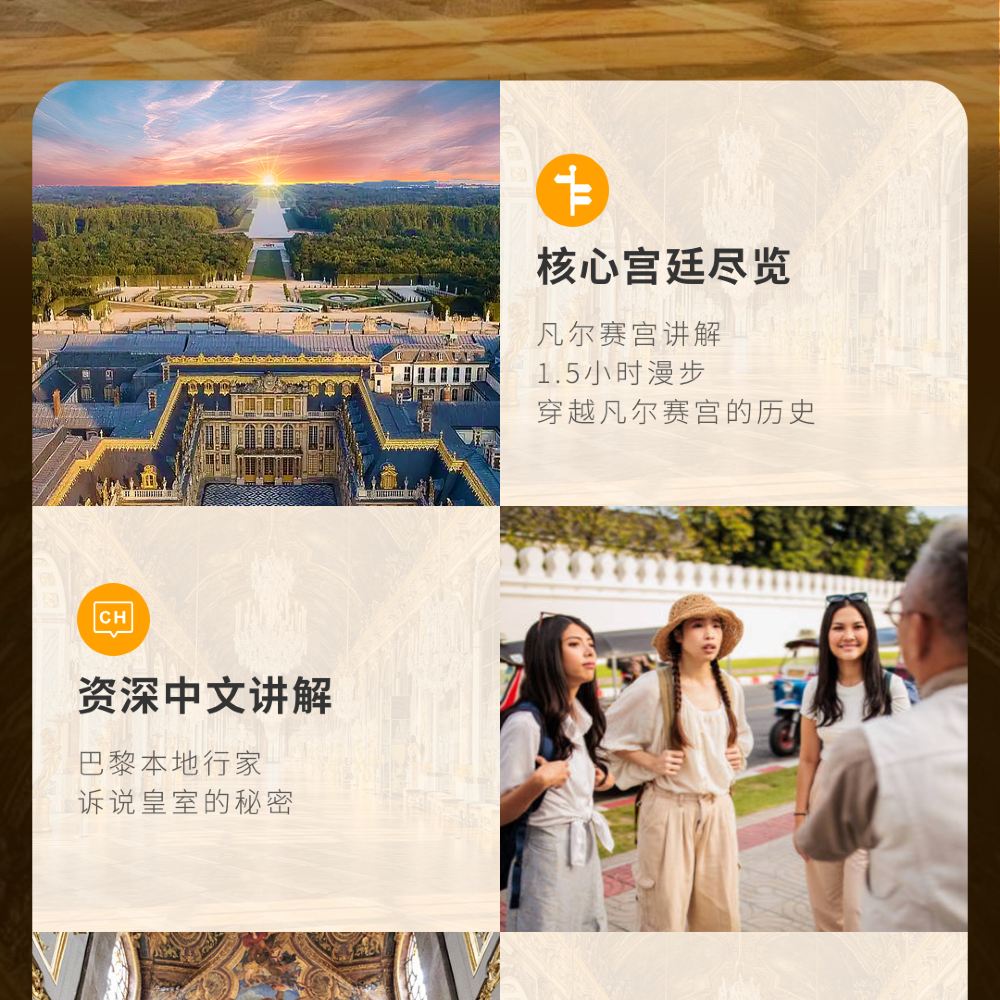 - 法國國家持證中文講解員領隊,以皇室秘聞與歷史細節串聯,1.5小時精華遊,探秘凡爾賽宮輝煌與陰謀。