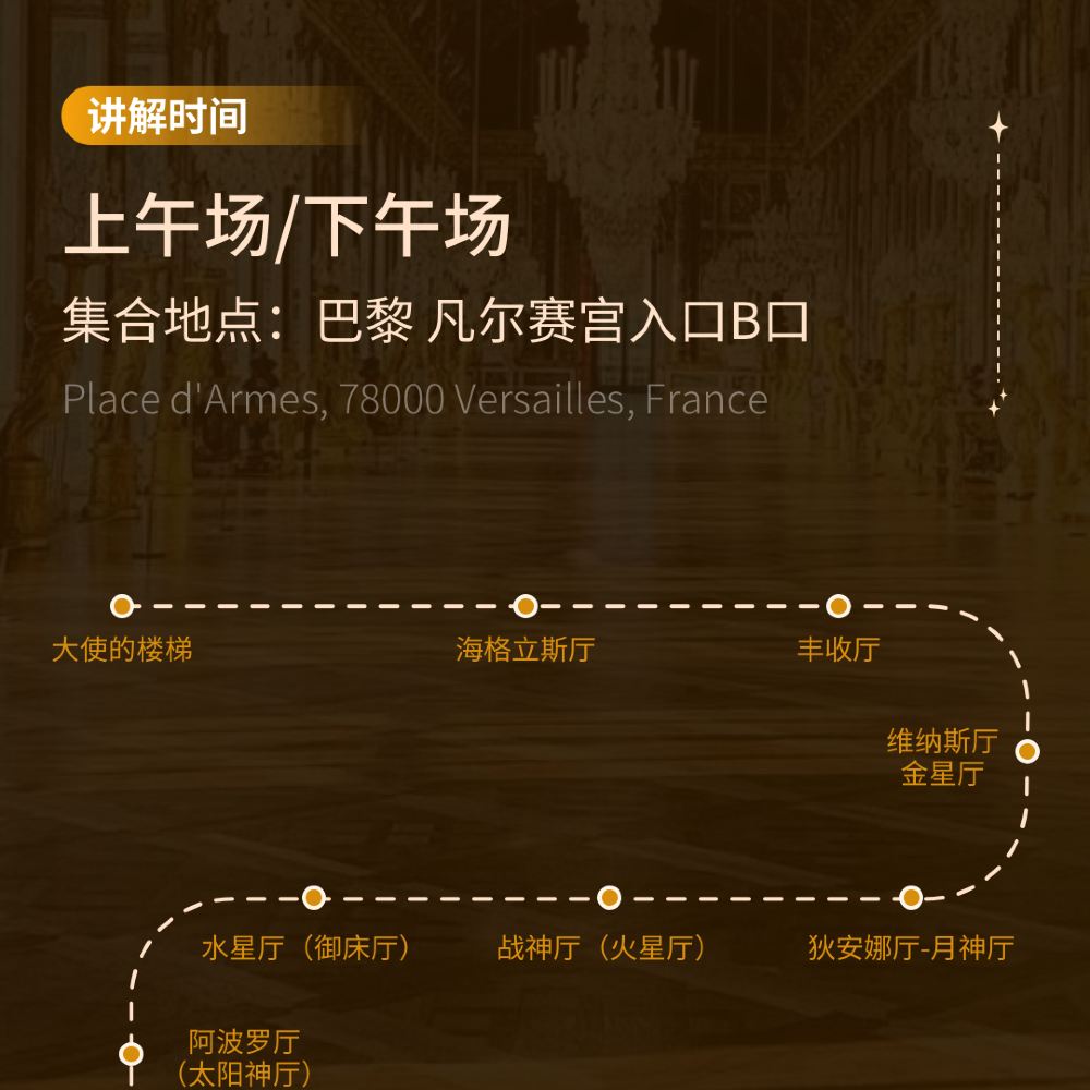 在集合地點集合14:50 凡爾賽 Place d'Armes, 78000 凡爾賽, 法國,凡爾賽宮B入口集合 集合 溫馨提示: [1]凡爾賽宮的講解需要預約團體票位置,通常一票難求,預約時間無法完全保證。具體時間可能會根據現場情況調整,請以實際安排為準。 [2]由於法國進入夏修期,多處路段封路,地鐵交通停運,交通十分不便,請提前預留充足時間前往凡爾賽宮【B入口】集合地點。 [3]此為團隊票,必須由講解員統一帶領方可入場。逾時到達者將無法進入,門票作廢且不退不改,請務必準時!