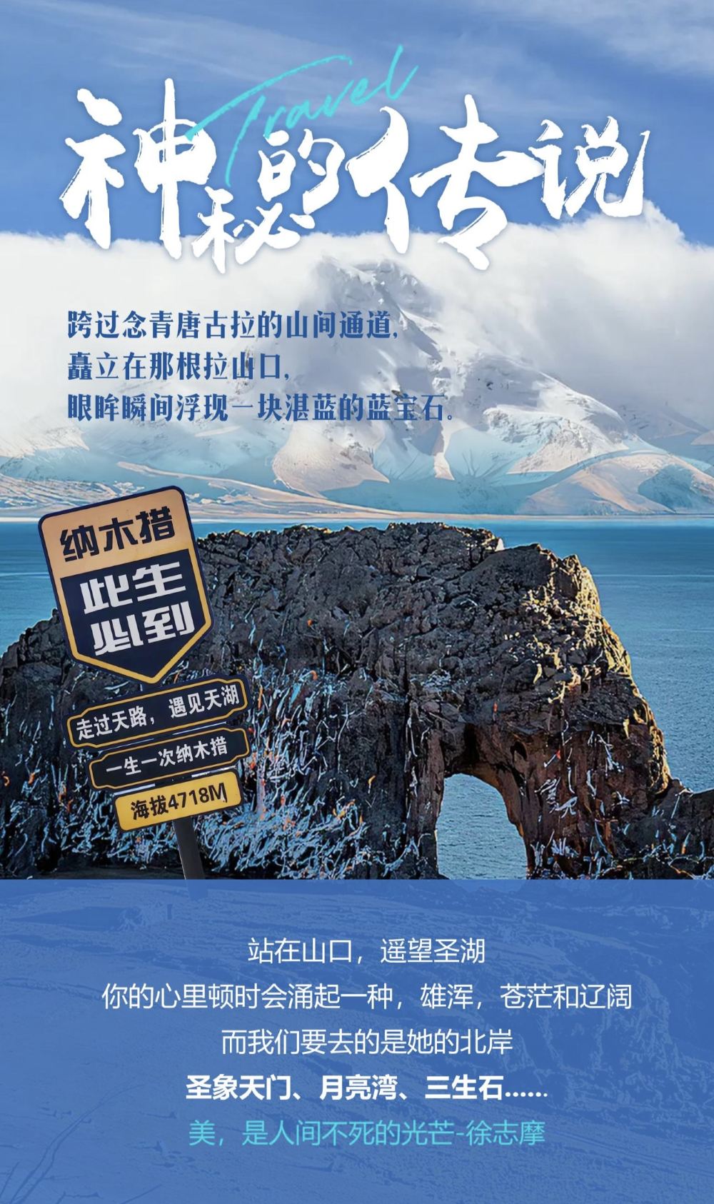- 震撼景觀:湛藍的納木錯與天際相融,天然石象的象鼻探入湖中,懸崖觀景台俯瞰月牙灣,念青唐古喇山相伴,如詩如畫