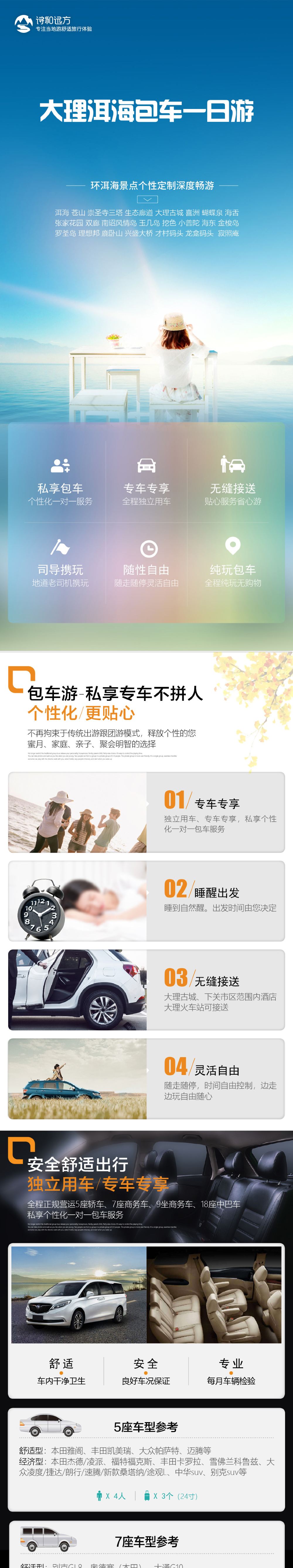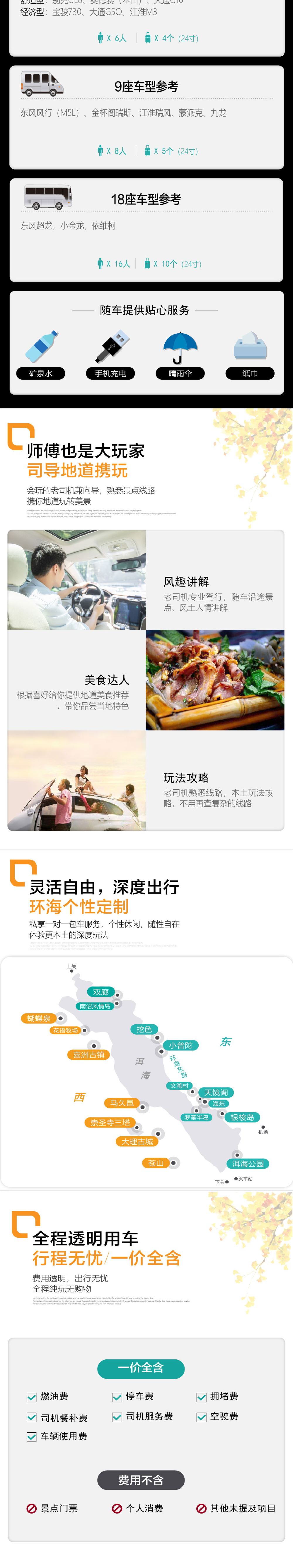 大理古城、下關新城範圍內酒店、大理火車站可接送,超範圍可根據酒店具體位置情況增加接送費用,提供接送; 溫馨提示:本產品屬於環海包車服務,環海一線景點可根據自己對景點興趣愛好,自由合理選擇;不含任何門票,用車時間參考範圍內為9小時(正常時間早九晚六),超出時間按80元/小時現補給司機;早餐