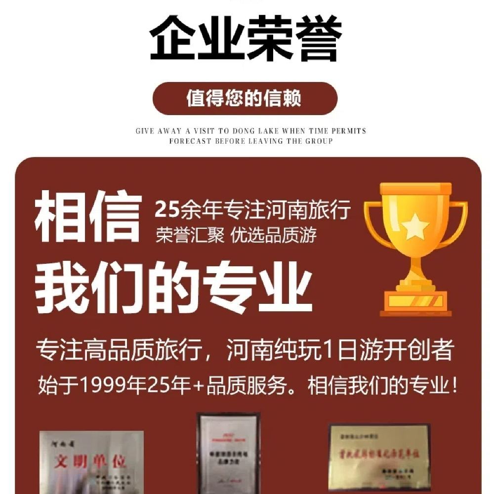 - 【品牌實力】禪源文旅始於1999年,專注於河南地接線路25餘年;純玩團始發者,連續多年評為先進單位。