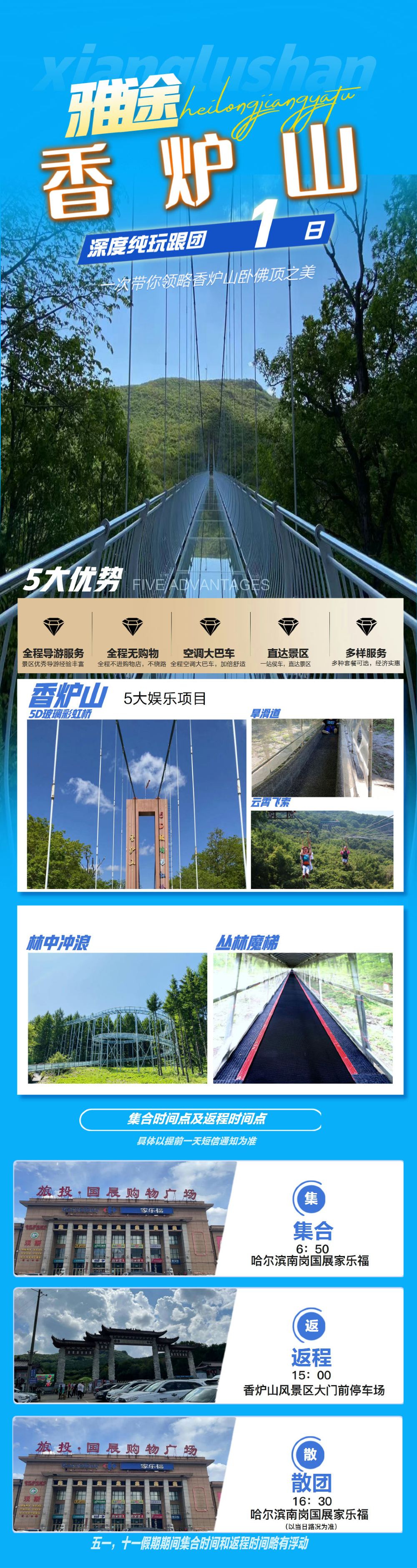 15:00 哈爾濱 哈爾濱市南崗區家樂福(國展·正大購物廣場店) 解散 五一、十一假期,為避免嚴重塞車,出發時間有所調整,早上6點半左右出發,下午4點半至5點左右返程