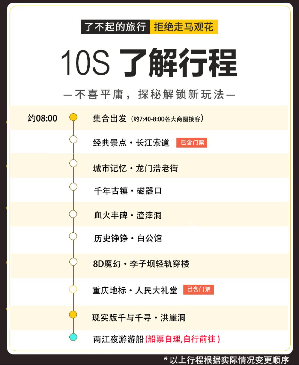 需購買含兩江遊套餐(8人精品商務小團+兩江夜遊船票)才包含兩江遊船票,比您單獨購買船票要便宜。行程結束後就地解散