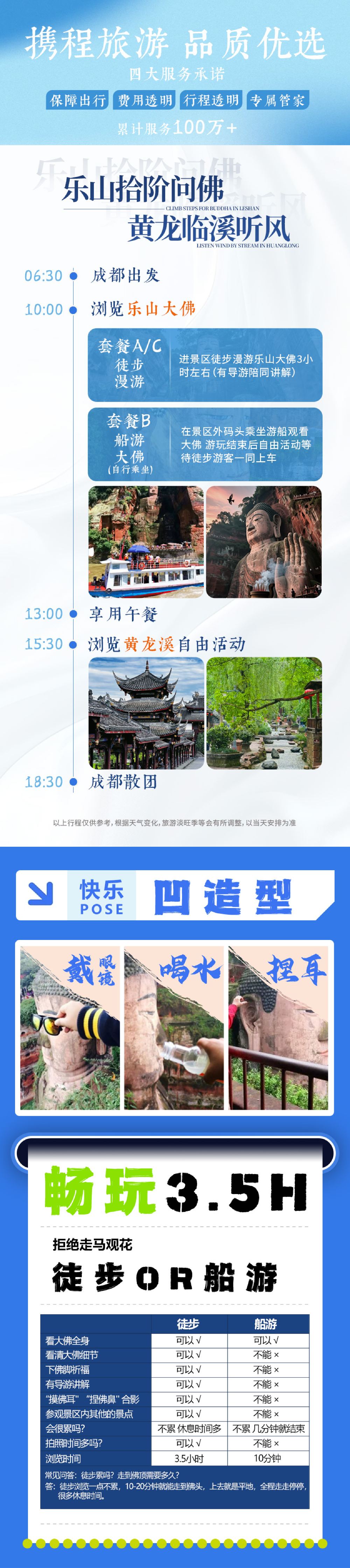 A/C徒步套餐:徒步漫遊3小時,優秀導遊深度講解 B船遊套餐:船遊觀大佛,景區船遊時間30分鐘左右景點活動