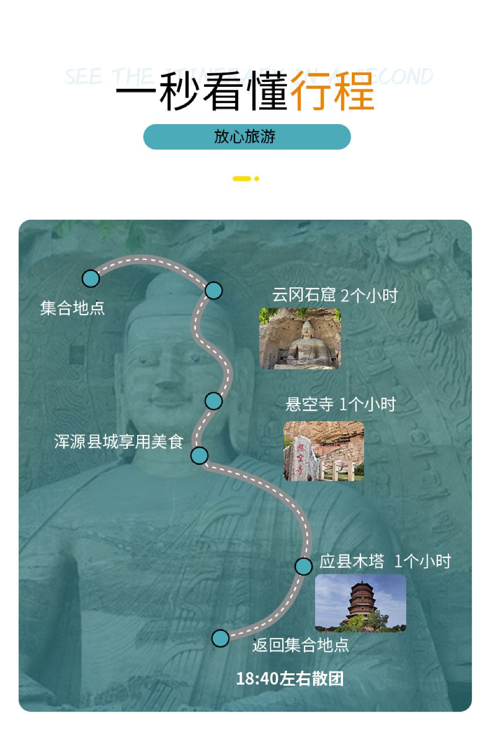 全程導遊跟車,3個景點都會講到。雲岡石窟講解2小時左右,懸空寺30分鐘左右,應縣木塔30分鐘左右。返回指定地點