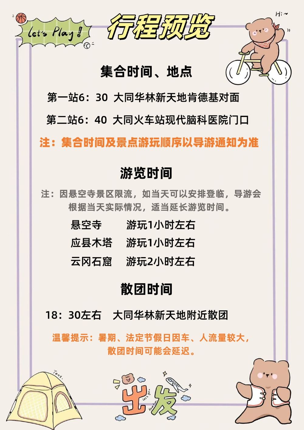 18:30 大同 華林新天地 解散 景點遊玩順序可能會因景區客流量而有所調整,以上行程僅供參考。