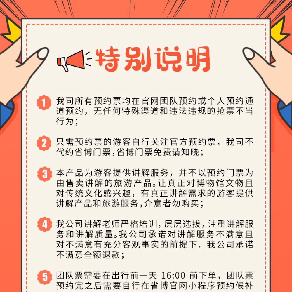 - 4.本產品本着為遊客提供講解服務為原則,並不以可預約門票為由售賣講解的旅遊產品。讓真正對博物館文物且對傳統文化感興趣,有真正講解需求的遊客提供講解產品和旅遊服務。介意者勿購買;