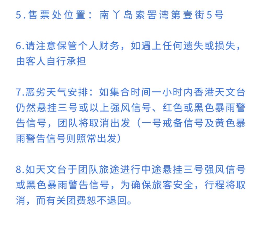 於尖沙咀5號公眾碼頭上船,碼頭位於鐘樓旁,請至少提前15-20分鐘自行前往碼頭準備登船交通