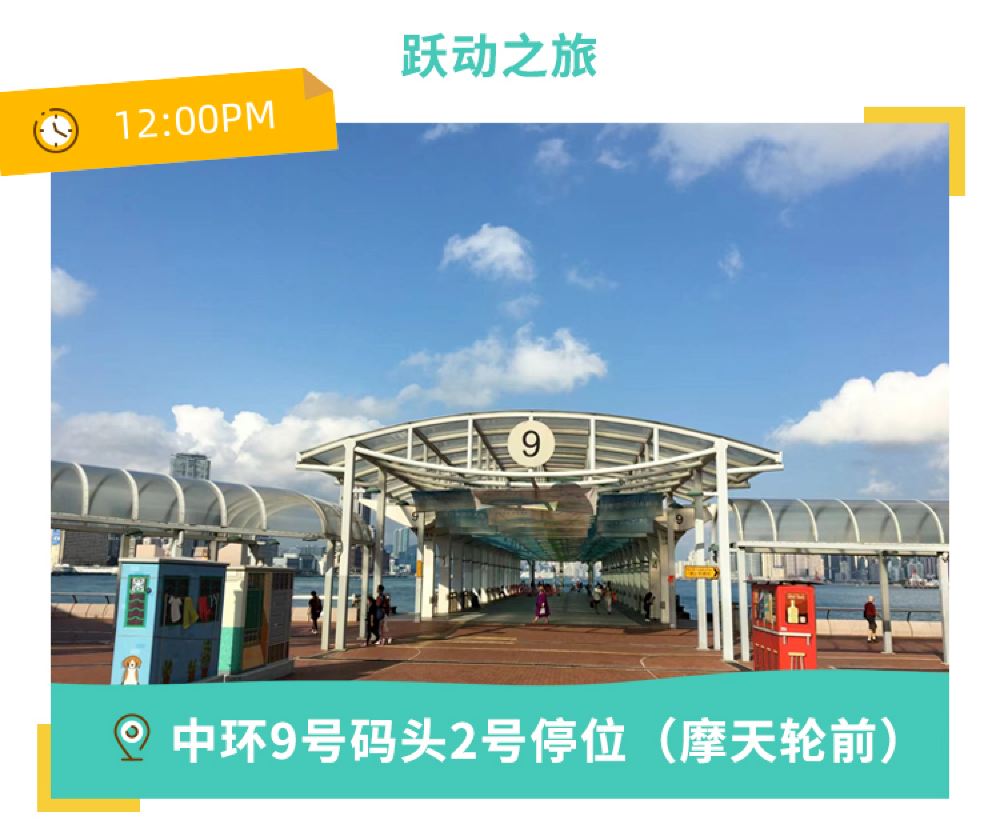 在集合地點集合12:00 香港 香港摩天輪 集合 中環9號碼頭2號梯台上船,位於中環摩天輪前;請至少提前15-20分鐘自行前往碼頭準備登船