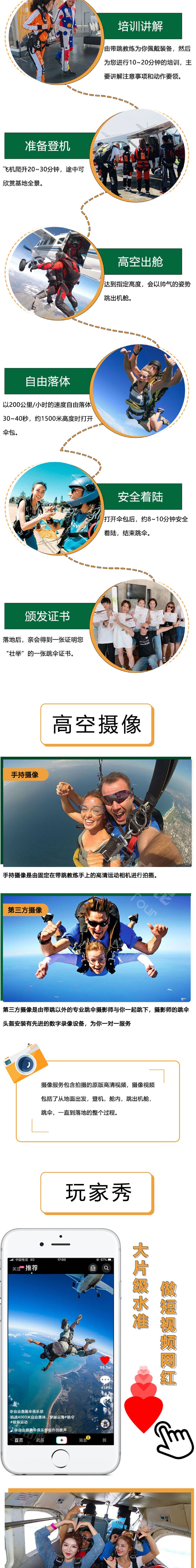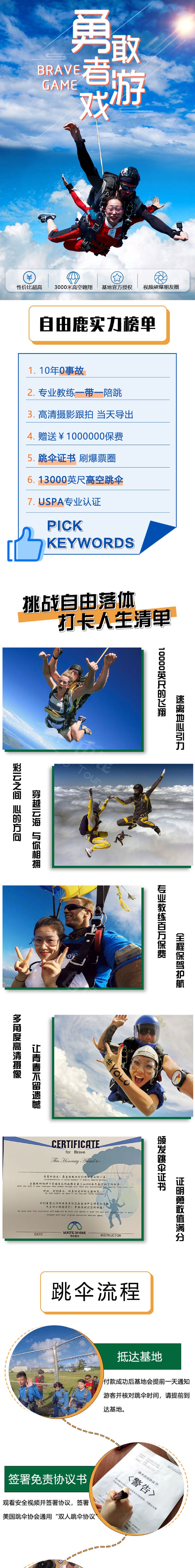 2. 整個跳傘活動,包括從當地酒店來回來回跳傘基地的乘車時間,包括空管和天氣等不可抗力因素建議預留1~2天時間體驗;
