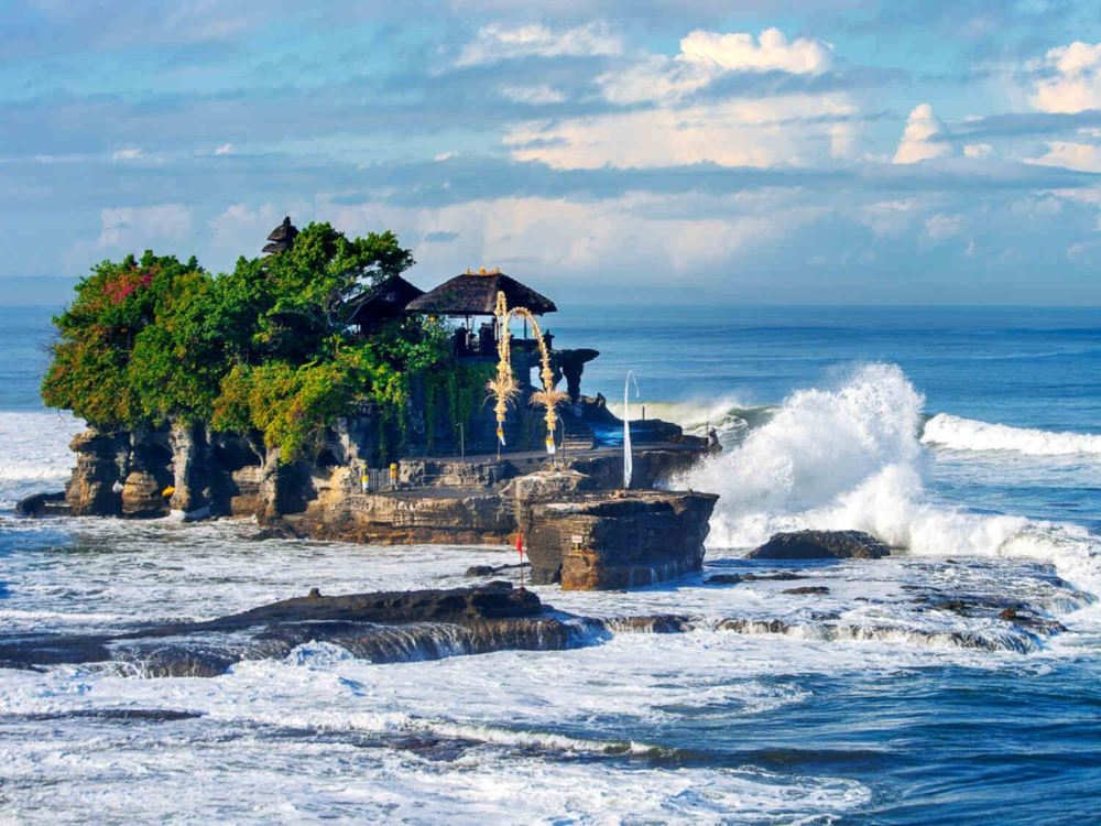 ▲海神廟(Tanah Lot Temple):峇里島著名的海上神廟,建於 16 世紀,坐落在離岸的礁石上。漲潮時海水環繞神廟,退潮時可步行至礁石底部,神廟與海浪、落日構成的畫面極具標誌性,是峇里島宗教文化的重要象徵。